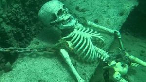 Reprenant leur souffle, les aventuriers poursuivent l’exploration. Tandis que les parois deviennent plus brutes et moins travaillées, un son sourd commence à se faire entendre, il va… vient… très doucement… très lointain. Et tandis qu’ils s’interrogent sur son origine et ses conséquences, ils font alors face à une caverne naturelle occupée en majorité par un lac souterrain. Curieux, les aventuriers décident de négliger les autres sorties de la caverne pour se lancer dans une expédition sous marine. L’eau est profonde, le barbare est donc envoyé en exploration, au cas où. Et cette idée, après un premier raté, leur permet de découvrir le cadavre d’un ancien mage de bataille et de récupérer un butin bien pratique.